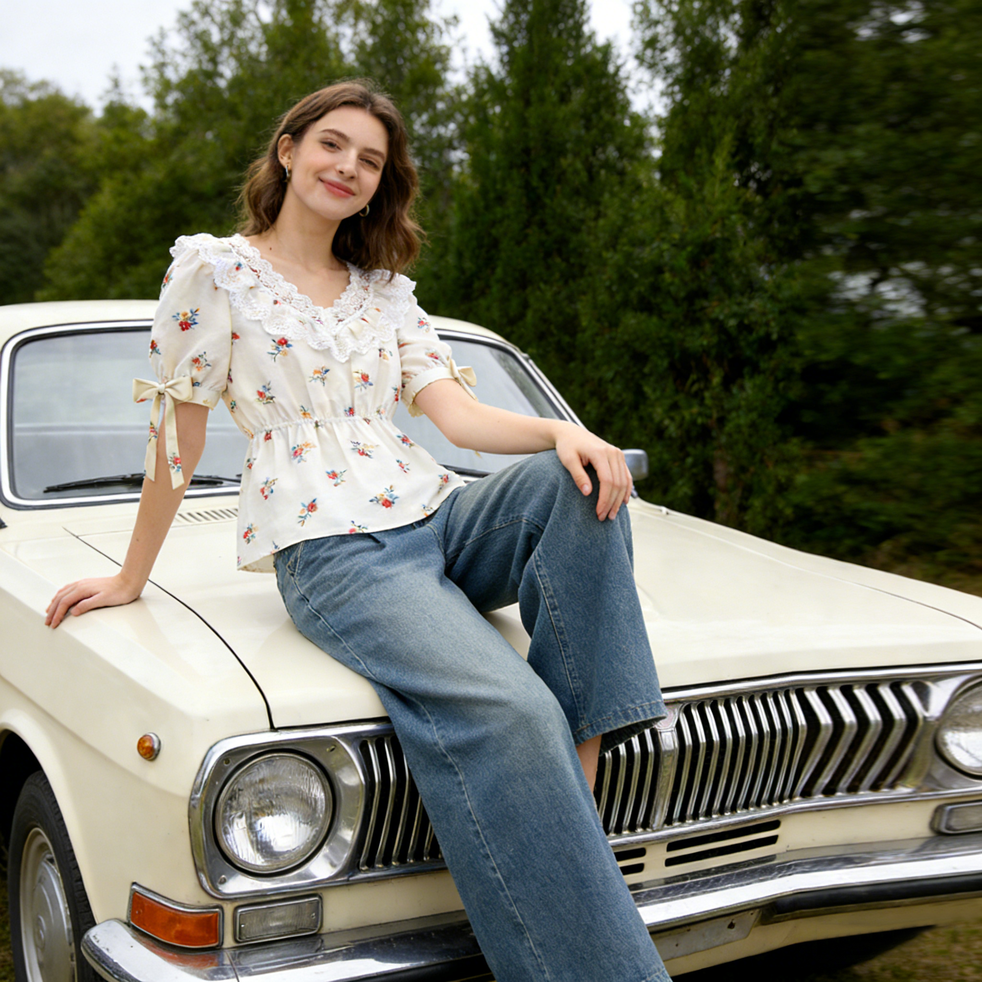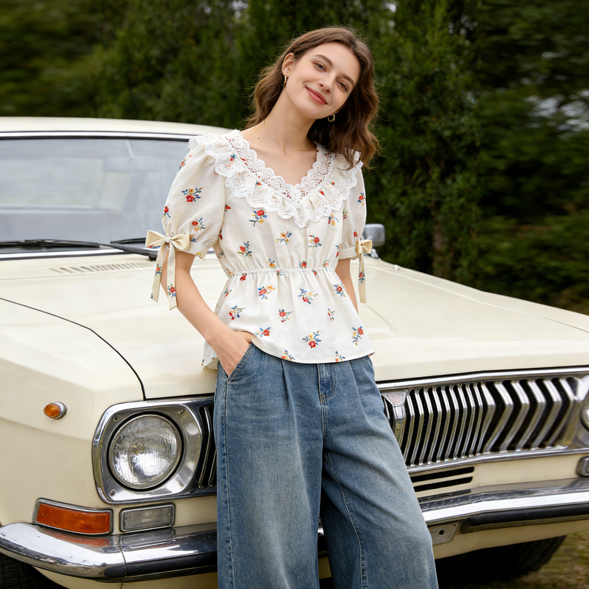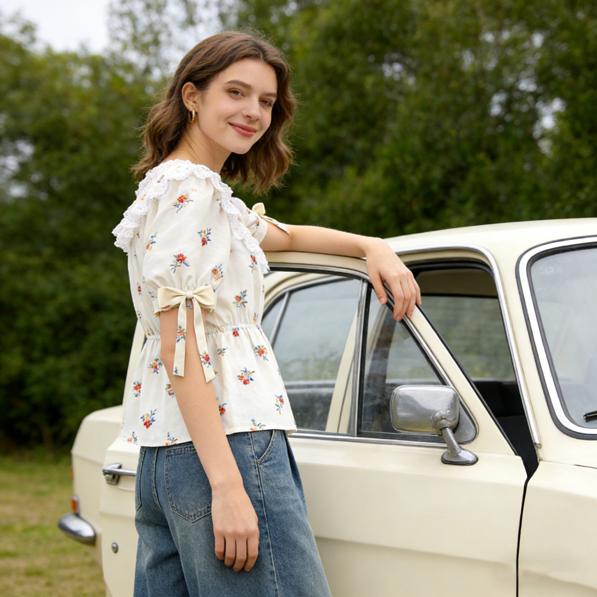 Elevate your cream floral lace puff sleeve waist-cinching blouse. The hand-drawn ditsy floral print delivers whimsical French-inspired charm, while the scalloped lace V-neck and puff sleeves with self-tie bow cuffs add delicate femininity and movement. Constructed from a lightweight, breathable cotton blend, this piece offers soft, all-day comfort with a gentle, structured drape. The elasticated waistband cinches the silhouette for a flattering, tailored fit, pairing effortlessly with high-waisted jeans, flowy midi skirts, or linen shorts for a polished, vintage-inspired look. Perfect for styling with espadrilles for a picnic in the park or ankle boots for a dreamy evening out. A versatile essential that bridges timeless romance with contemporary ease.