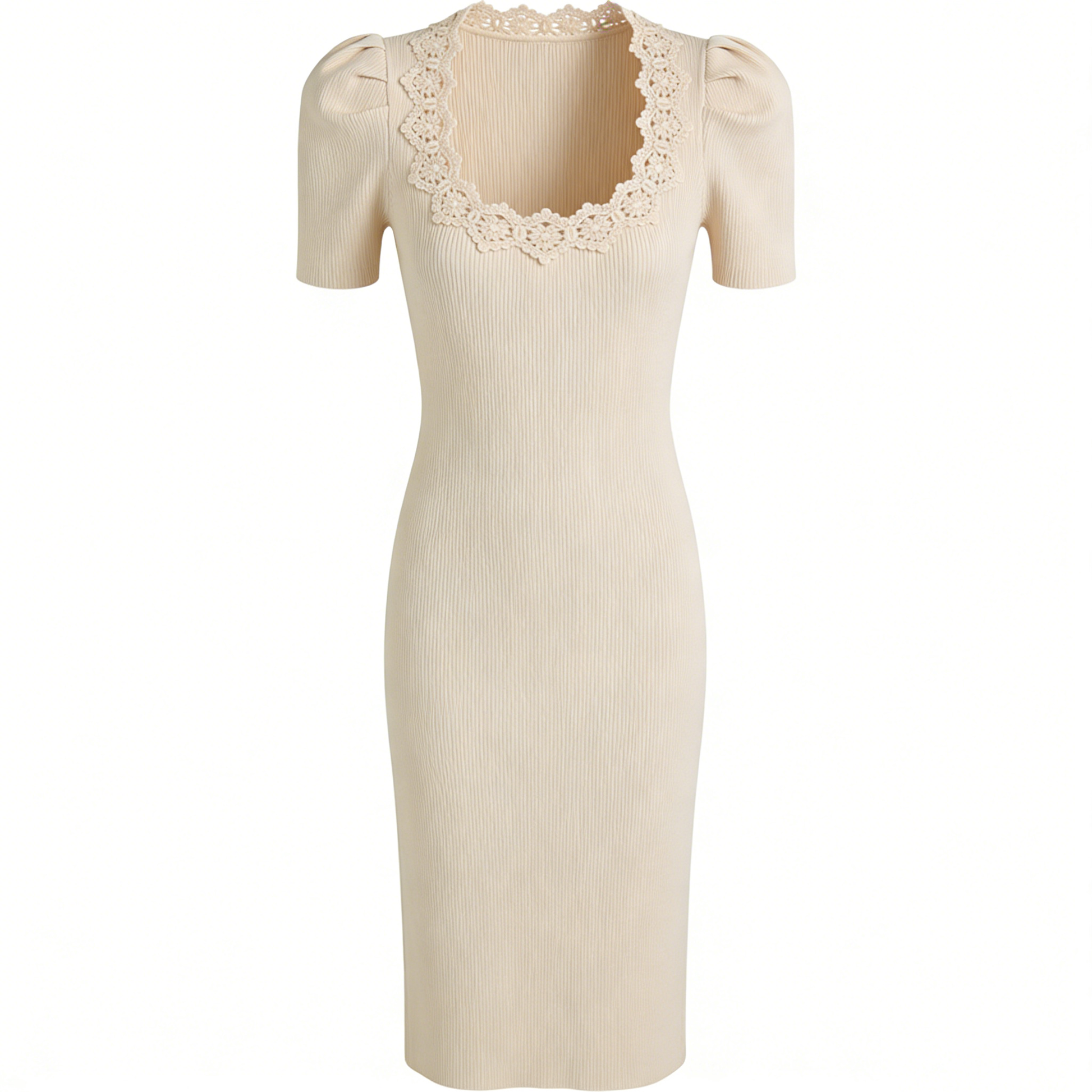 Elevate your wardrobe with this sophisticated cream knit midi dress, featuring distinctive puff sleeves that add contemporary flair to a timeless silhouette. Crafted from quality knit fabric, this piece offers comfortable wear throughout the day while maintaining a polished appearance. The midi length provides versatile styling options—dress it up for evening occasions or down for casual outings. The textured puff sleeves create visual interest and a flattering frame, making this dress a standout addition to any collection. Perfect for those seeking refined elegance with modern design details.
