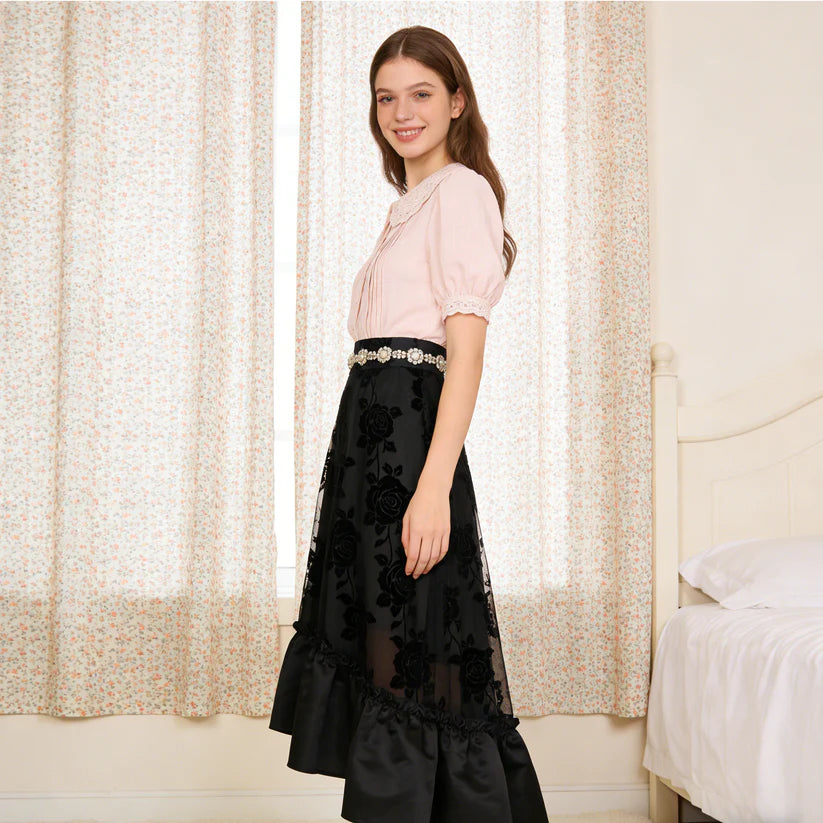 Elevate your wardrobe with this sweet Pink Lace Peter Pan Collar Blouse, a romantic piece that blends vintage charm with delicate femininity. Crafted from a soft, lightweight fabric in a gentle blush hue, it features an intricate lace Peter Pan collar, a button-front placket trimmed with delicate lace, and vertical pleats that add subtle structure. The voluminous puff sleeves are finished with matching lace cuffs, enhancing its nostalgic, whimsical appeal.