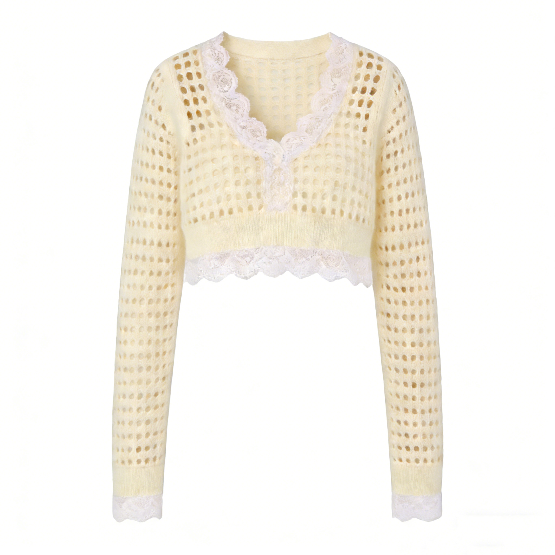 Elevate your yellow mesh knit crop cardigan. The delicate openwork mesh pattern in a soft cream hue brings a light, airy feel, while the scalloped white lace trim at the neckline, hem, and cuffs adds a touch of romantic coquette charm. Crafted from a plush, fuzzy knit fabric, this piece wraps you in gentle warmth while maintaining a structured, figure-flattering silhouette. Its cropped length sits perfectly at the waist, making it effortless to pair with high-waisted jeans, flowy midi skirts, or tailored shorts for a polished, nostalgic look. Whether layered over a slip dress for a garden brunch or styled with leather trousers for an edgy twist, this cardigan is a versatile essential that blends timeless romance with modern comfort.